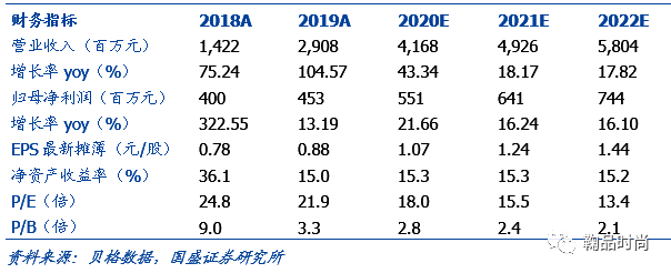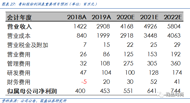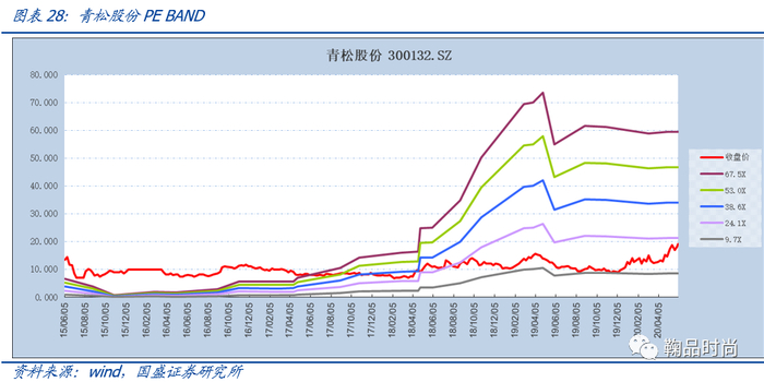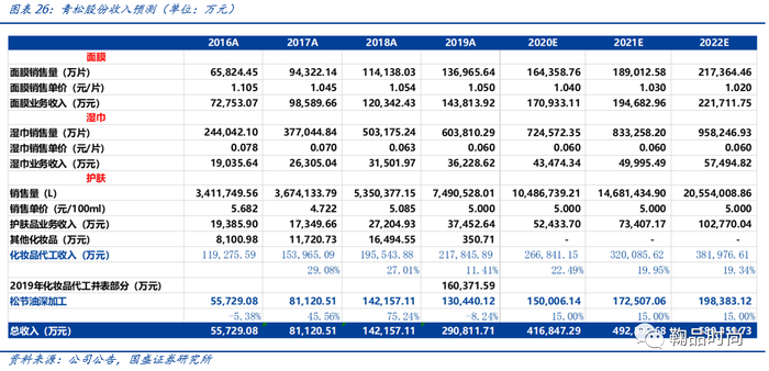 预测面膜和湿巾特色每年为公司带来较稳定的下游订单15%-20%增长,护肤品代工未来快速补充,两者共同推动面膜收入保持20%左右的增速。松节油深加工业务受上游原料价格波动影响较大,假设每年15%的复合增速。预测青松股份2020-2022年的销售收入为41.68/49.26/58.04亿元,综合净利率在13%左右,对应2020-22年归母净利润5.51/6.41/7.44亿元。