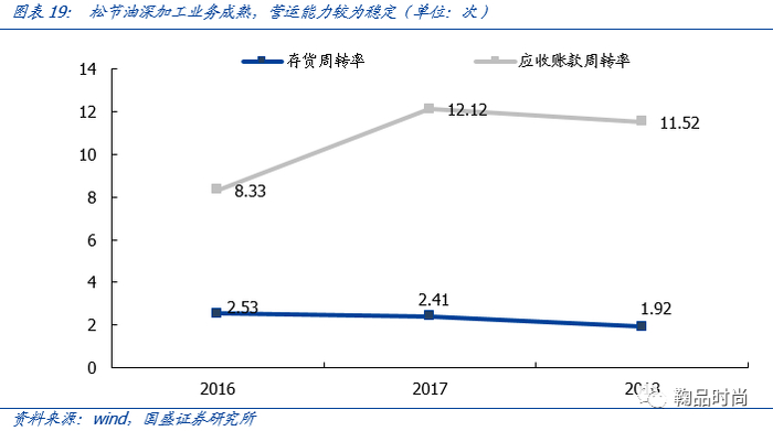 松节油深加工业务营运能力较稳定,存货价值与原料价格相关度高。2016-2018年应收账款周转率分别为8.33/12.12/11.52次,存货周转率分别为2.53/2.41/1.92次,2018年存货周转率小幅下降主要系原材料采购价格上涨,公司库存的存货金额较期初相比增加。