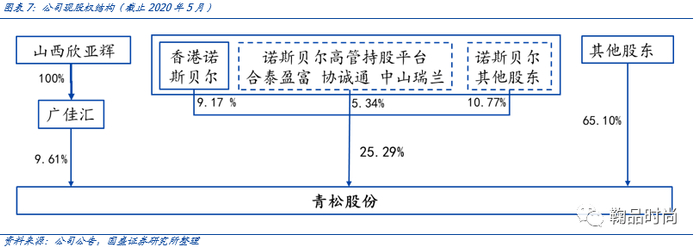 公司从2016年9月起股权变动频繁,目前无实控人,诺斯贝尔及其高管持股平台(合富盈泰、协诚通、中山瑞兰)合计持有青松股份14.52%股权,诺斯贝尔原股东合计持股25.29%。