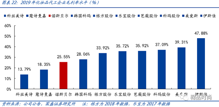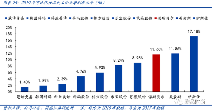 化妆品代工由于是2B业务,毛利率相对于2C品牌较低,通常为10%-30%,各企业因生产效率、工人熟练程度和原材料采购成本等不同而存在差异。诺斯贝尔2018年由于扩展产能和打开市场份额的需求,成本较大提升而收入价格有所下降,因此2018年化妆品代工业务毛利率同比显著下降3.5pcts,2019年(5-12月合并部分)同比回升3.2pcts至27%。