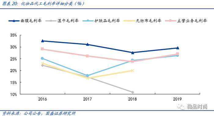从历史情况来看,诺斯贝尔在护肤品类的订单稳定性弱于面膜,因此护肤品系列毛利率波动与当期承接的护肤品品类相关度较高。护肤系列包含的品类繁杂,有爽肤水、润肤水、手霜、润体霜、面霜、唇膏、卸妆膏、冻干粉、安瓶等,各品类的毛利率水平差异较大,例如诺斯贝尔在2016年承接的某款男士精华露单品毛利率26.50%,占护肤品系列收入的7.35%,推高了2016年护肤品系列的毛利率水平。2019年冻干粉和安瓶等生产线的增添对护肤系列代工毛利率的提升起到一定正向影响。