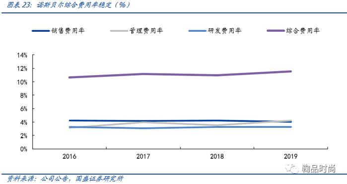 综合费用率较稳定。诺斯贝尔的销售费用、管理费用和研发费用率常年保持平稳,财务费用波动较大,主要受到利息支出和汇兑损益的影响。2016年/2017年/2018年/2019年,人民币对美元总体走势分别处于贬值/升值/贬值/基本持平的趋势,诺斯贝尔存在部分出口收入,大部分以美元结算,汇率的波动导致诺斯贝尔汇兑损益出现同趋势的波动。
