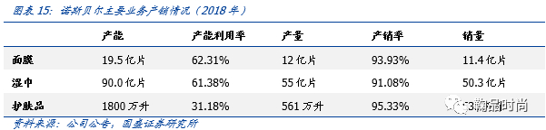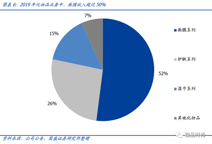 诺斯贝尔母公司无纺布起家,发挥所擅领域优势形成以面膜为优势品类的产品结构。诺斯贝尔是国内较早将无纺布及日化技术相结合的ODM厂商,截至2019年,面膜产品依然是其第一大收入来源,占比52%,其余护肤占比26%,湿巾占比15%。