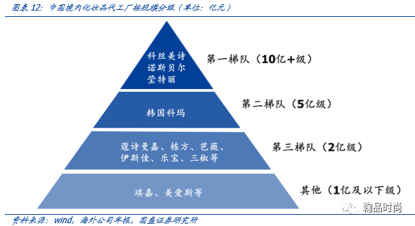由上述产业利润链条,反推4500亿元化妆品终端零售额对应1125亿元化妆品成本规模,其中50%由代工构成,推测中国国内化妆品零售额对应500-600亿元化妆品代工市场,推测全球化妆品代工产业在4000亿元以上。中国境内前四工厂科丝美诗/诺斯贝尔/莹特丽/科玛2019年收入水平分别为28亿元/22亿元/10亿元(2017年)/4.5亿元,部分实力较强的中国及韩国在华代工厂可达到2亿元年销售额水平。前三梯队总计约占中国化妆品代工市场份额的15%,化妆品代工行业格局较分散。