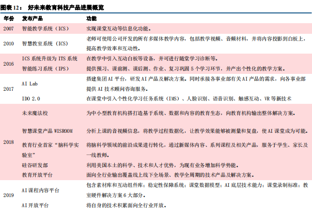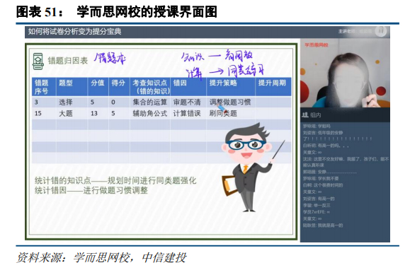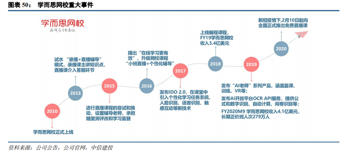 打破地理空间限制,技术赋能下学而思网校逐步走向成熟。学而思网校成立于2010年,为6-18岁孩子提供小初高全学科课程辅导,最初以录播课形式提供在线教育服务,2015年推出“TEPC”翻转课堂,设置辅导老师,创立直播+录播+实时反馈的线上教育模式。2016年好未来正式推出学而思网校直播课,2017年发布IDO 2.0系统,在课堂中引入个性化学习任务系统IMS、人脸识别、语音识别、触感互动等新技术,2019年通过AI优化课堂体验。