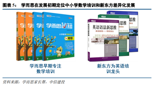 学而思前身于2003年起步,一直以直营方式发展,最初定位于提分效果显著的小初数学培训,与当时已颇有名气但业务主要在大学生出国英语培训的新东方错位发展,在当时二者定位不同学科、不同学生群体。相比于英语、语文等语言学科,数学培训的教学结果易于量化、补习带来的提分效果最为显著,竞赛也影响力广泛,在短时间内易于快速树立起培训机构的品牌。