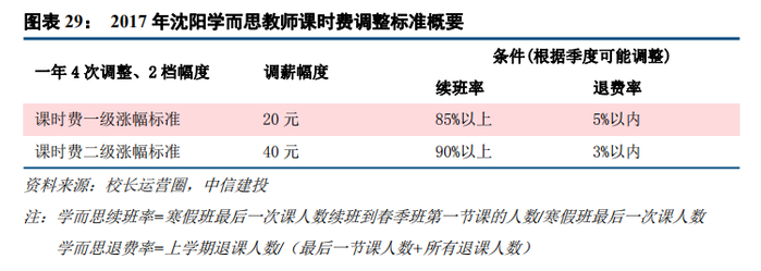 教师激励方面好未来以课时费提升为主,续班率、退费率是核心考核指标,实现优质教师留存越久课时费越高的正向循环,而新东方以续班奖为主。以2017年沈阳学而思为例:沈阳学而思新教师初始课时费约240元/节,教师在每个季度均有一次提升课时费的机会,一年共4次调整机会。涨薪幅度大体分两种:一级涨幅标准:续班率>85%、退费率<5%,涨20元/节;二级涨幅标准:续班率>90%、退费率<3%,涨40元/节。