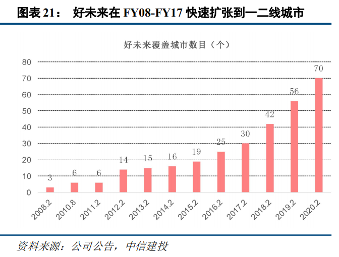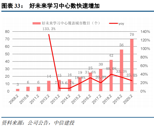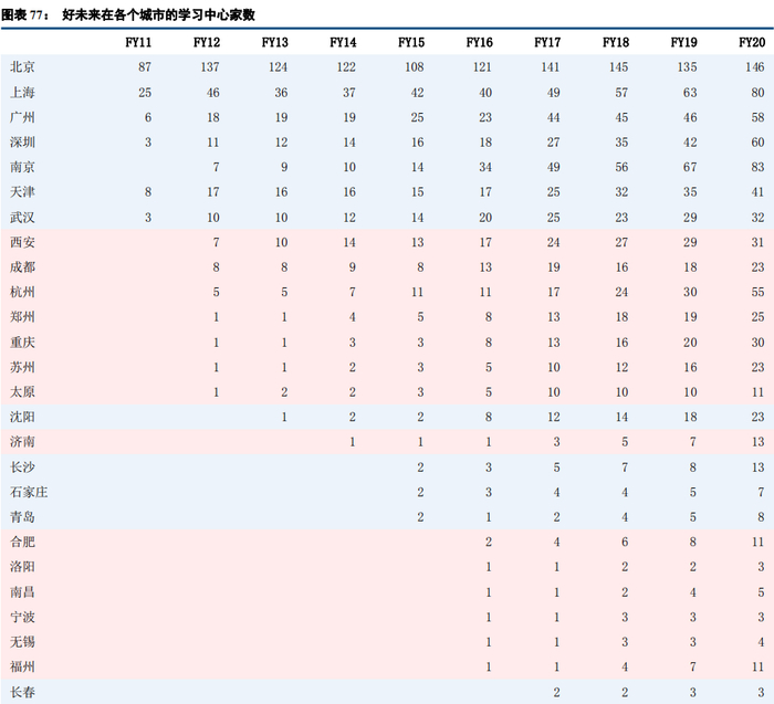 新进入城市时,公司通常仅开设一家学习中心,树立口碑后再在当地扩科和扩培训网点。公司在进入新城市时,一般只先设立1-2个学习中心,在运营2-3年树立起优质口碑后,再逐步扩大培训科目、开设新学习中心。以苏州、宁波、常州为例,FY12-FY20年底苏州的好未来学习中心数目分别为1、1、2、3、5、10、12、16、18、23个;FY16-FY20年底宁波的好未来学习中心数目分别为1、1、3、3、3家;FY18-FY20年底常州的好未来学习中心数分别为2、2、5家。