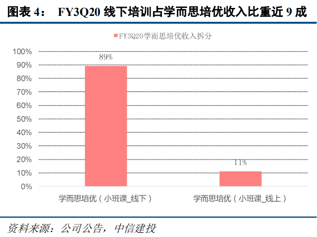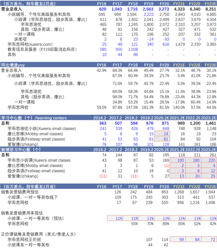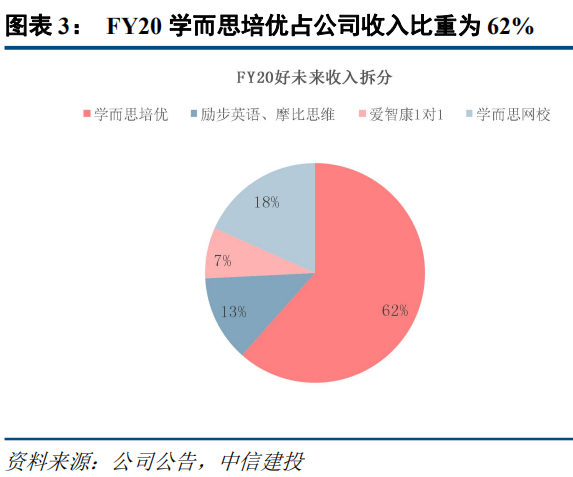 学而思培优是公司核心业务,FY20 收入占比为 62%,学而思培优分为线下小班面授、学而思(培优)在线、学而思双师课堂。学而思网校则通过线上向全国 K12 阶段学生提供在线双师大班直播课,涵盖学科培训及科学等素质拓展课,FY20 收入占比18%。摩比思维和励步英语面向 2-15 岁学生分别提供 STEM 教育和英语教育,FY20 收入合计占比 13%。爱智康主要提供 1 对 1 家教课,FY20 收入占比 7%。