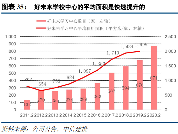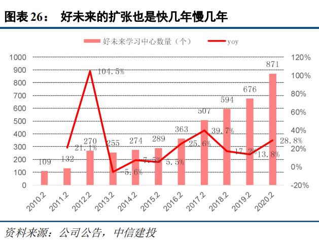 复盘好未来线下崛起和发展之路,成功的核心点在哪?截至2020年2月底,好未来在国内外70个城市共有871个学习中心,是国内最大K12培训机构,旗下品牌包括学而思培优、学而思网校、爱智康、摩比思维、励步英语等。公司线下发展可分为:1)崛起:定位数学培训,培优模式下树立优质口碑与快速传播;2)成长:打造强大中台,专业化分工下的标准化输出与优质教师规模化培养;3)异地扩张:家长帮沉淀海量流量,培优定位下教学本地化压力相对较轻,先建立口碑再在本地复制;4)以人为本:股权激励绑定管理层,课时费提升实现教师激励的正向循环。在线下为主的K12培训时代,FY10-FY12为公司的快速扩张期,学习中心从109个快速增至270个;FY13-FY15为调整期,学习中心从255个缓慢增至289个;FY16-FY17再次快速扩张,至FY17达507个。