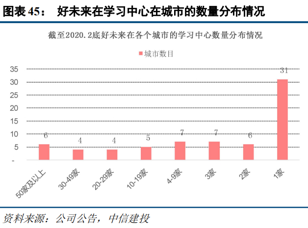 双师课堂助力下,2016年以来学而思培优在三四线城市加速下沉,新进入城市数量大幅提升。FY12-FY20好未来线下学习中心所覆盖城市数分别为14、15、16、19、25、30、42、56、70个,F17后新进入城市快速增加,FY17-FY20的3年时间新进入40个城市。2017-2019年间,学而思培优新进入的城市大多开设学习中心数为1个,比如2018年进入的徐州、海口、唐山,2019年进入的台州、宿迁、枣庄等城市,进入头2年以在当地树立优质口碑为主。截止到2020年2月,公司在当地仅有1家学习中心的城市有31个,预计新冠疫情得到控制后三四线城市线下学习中心开设将进一步提速。