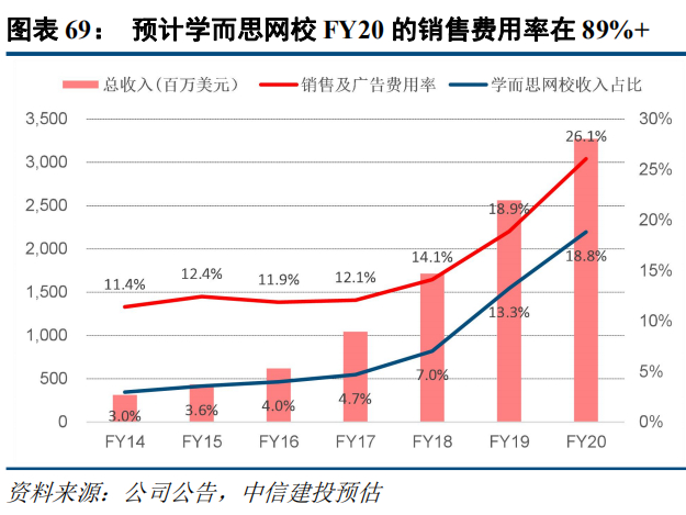 收入高增长之外,学而思网校何时能走向盈利?伴随学而思网校的快速发展,FY17以来公司销售及营销费用率亦快速提高,FY17至FY20学而思网校的收入占比从4.7%提升至18.8%,销售及营销费用率从12.1%增加至26.1%。在此按照线下业务11.0%的销售费用率进行预估,则学而思网校的销售及营销费率预计从FY17的34%左右快速增加至FY20的89%,主要是受在线教育行业竞争激烈,各家大幅投放广告和促销课争夺用户所致。从目前的续班率来看,学而思网校已经能做到70%左右,我们预计伴随续班率的进一步提升,未来2-3年销售费用率会持续改善。相比于线下小班课55%-60%的毛利率水平,在线双师大班课的毛利率更高,可以做到70%-75%,如果未来双师大班课的销售费用率能控制在50%-55%以内,则有望实现盈亏平衡。长期来看,伴随市场的逐步出清,在线教育行业的净利率能达到线下小班培训10%-15%的水平。