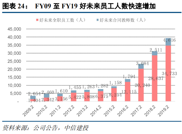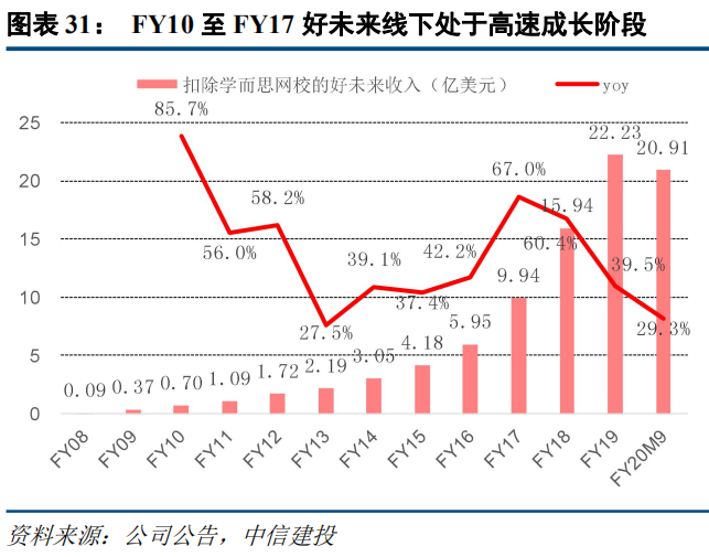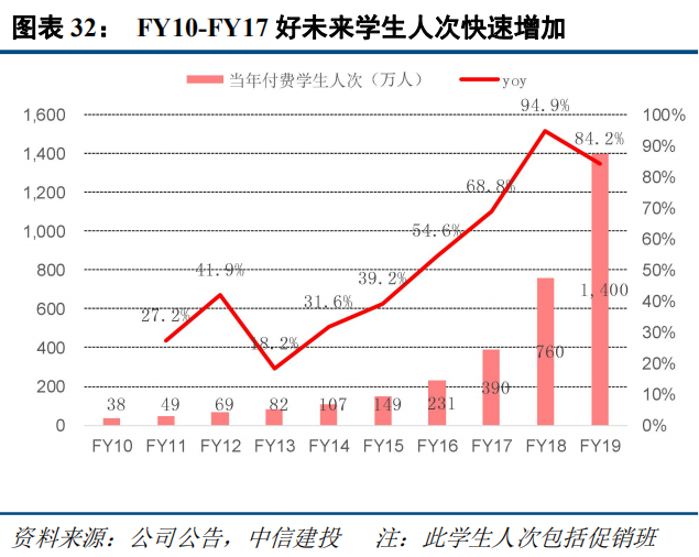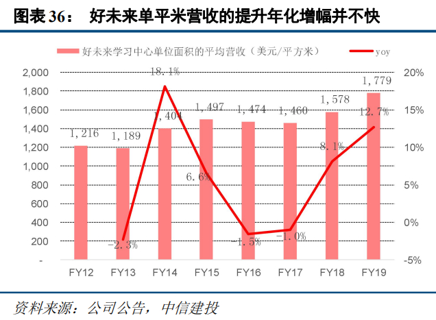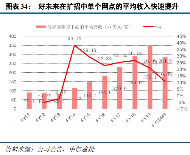 注:1)FY18-FY19好未来加大在线教育投入力度,学而思网校的低价付费学生人数增速提升,使用“付费学生人次/学习中心数量”测算学习中心运营效率有失真。2)单个学习中心营收贡献=(好未来总营收-学而思网校营收)/好未来学习中心总数。