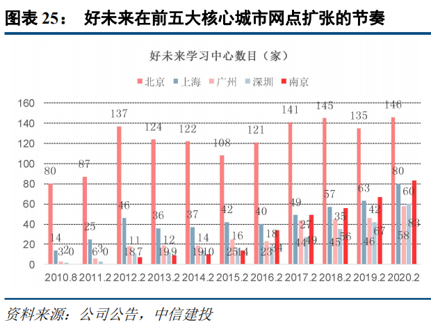 但即使是好未来,异地扩张之路也不是一帆风顺的。2008-2009年好未来走出北京快速进入上海、广州、天津、武汉几个大城市,其中上海、广州是依靠收购本土培训机构切入,上海地区学习中心数量从2010年8月的14家快速增加至FY12的46家,但是由于和被收购团队的磨合及爆发增长下师资力量短时间跟不上的影响,之后进入5年的漫长调整期,直至FY17学习中心数量才达到49家。2010年公司进入深圳市场,策略已经改为直接设立网点而非并购,通过清北毕业的教师快速积累起势能,深圳的培训中心数量从2010年8月的2家至FY11的3家,至FY12的11家,之后稳步发展至FY16的18家,才开始新一轮高速扩张,至FY20为60家。整体来看,FY10-FY12为好未来的快速扩张期,学习中心从109个快速增加至270个;FY13-FY15为调整期,学习中心从255个缓慢增加至289个;FY16-FY17再次进入快速扩张期,至FY17达到507个。