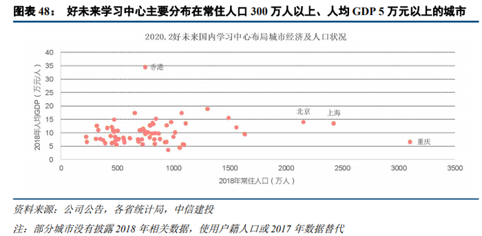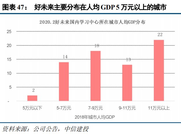 好未来线下学习中心进入的城市有何特点?根据统计,好未来在过去几年的学习中心下沉城市基本为常住人口300万以上、人均GDP 5万元以上的城市,以截止到FY20进入的国内69个城市为例,人口超过300万的城市占比达到67个,人均GDP超过5万元的亦为67个。