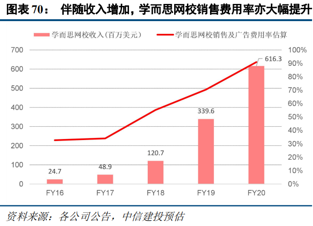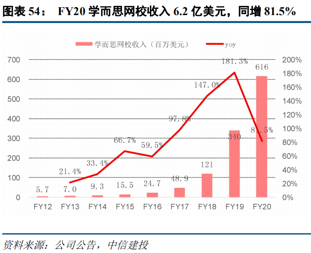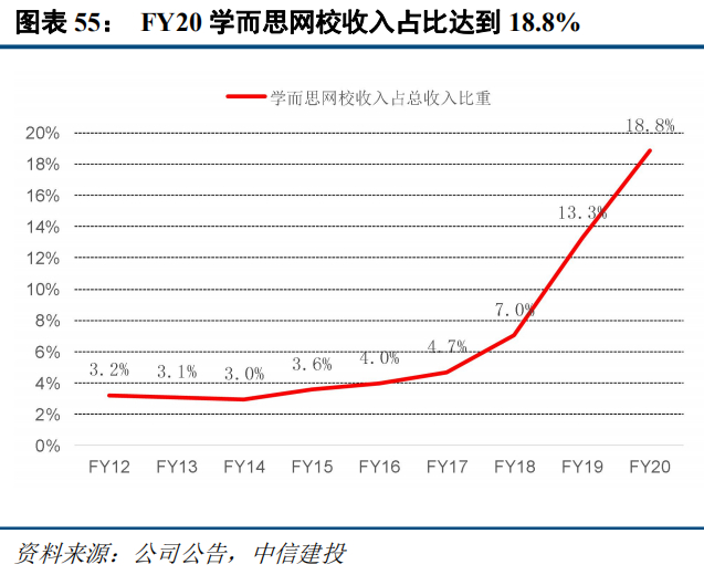 FY17后学而思网校步入快速增长期,FY20收入占比已至19%。FY12-FY16期间,学而思网校占公司收入比重在3.2%-4.0%之间。伴随直播课的推出和辅导老师的引入,学生体验和续课率均大幅改善,FY17学而思网校收入为4890万美元,同比增长97.8%,增速比前一年大幅提升38.3个百分点。FY20学而思网校收入6.16亿美元(43.2亿人民币),同比增长81.5%,收入占比提升至18.8%。