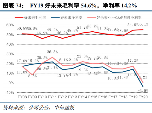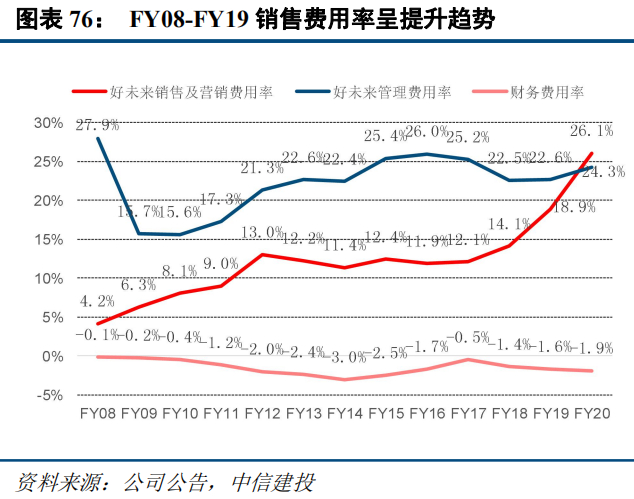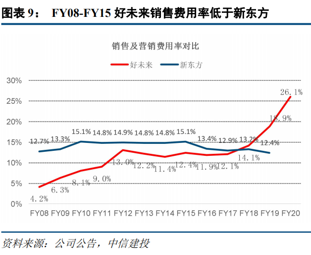 大量学生主动报名背景下,公司销售费用率维持在同业较低水平。FY08-FY15好未来的销售及营销费用率在4.2%-13.0%波动,低于同期新东方12.7%-15.1%的水平。(注:FY08学而思学习中心只在北京地区,售费用率低至4.2%;FY09后公司异地扩张带动后期销售费用率提升;FY17以来公司大力开拓学而思网校使销售费用率大幅提升)