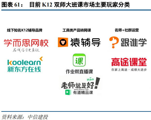 获客成本并不是学而思网校最大的优势,精细化运营管理和批量培养老师的能力才是。目前K12双师大班直播课市场头部公司包括学而思网校、猿辅导、作业帮、跟谁学、新东方在线,其中学而思网校和新东方在线是线下知名K12辅导品牌切入线上,猿辅导、作业帮、有道是工具类产品转网课(具备一定流量优势,其中猿辅导作业帮接近一半流量来自题库或者工具类产品转化),跟谁学则是通过名师模式和社群运营快速崛起,其中学而思网校正价课的生均销售费用预估在100美元左右。我们认为学而思网校的长期优势在于其具有丰富的K12培训经验,对名师的依赖度较低,且具备快速批量培养高质量辅导老师的能力,而辅导老师对于学生的续费起到主要影响作用。