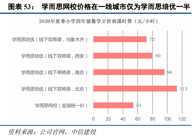 学而思网校课程难度低于学而思培优,覆盖学生面从优等生下沉到中等生,相对较低的课程价格有助于学而思网校服务更多学生群体,促进教育公平。相比于以在线下培训尖子生为主的学而思培优,学而思网校的课程难度相对较低,更适合广大成绩中等及中下等的学生群体,这类学生也是学而思培优未能覆盖的市场,整体来看学而思网校和学而思培优之间竞争关系极低。从定价来看,以2020年学而思网校夏季四年级数学正价课为例,其价格在810元/科/季度,课时费为54元/h,约为一、二线城市学而思培优线下班的一半,和三、四线城市线下培训的课时费接近,相对较低的客单价有助于学而思网校获取广大三四线城市的学生群体。