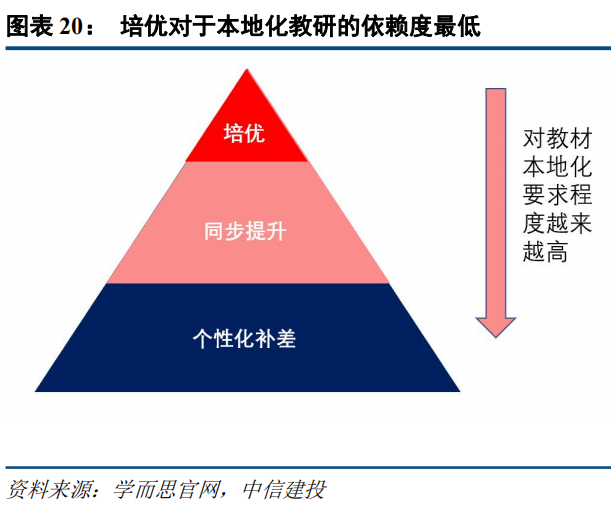 线下培训机构的品牌传播力具备区域性,异地扩张时需要在当地新建立口碑,培训机构需做好前期调研、教材的本地化研发(各地考试千差万别)、种子用户的储备等。其中,教材的本地化研发根据定位的不同又有所差异,比如主打中等生时需要本地化同步课堂做的非常细致,而做优等生则更多是拔高培训。