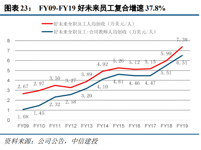 得益于大中台体系的支持,好未来快速扩张之际,人均创收维持在行业前列。从FY09到FY17,好未来的全职员工人数从1404人快速增加到2.02万人,FY16、17好未来人均创收约5.12、5.15万美元(在此分母为全职员工计算,若包括合同教师人均创收约为4.46万美元),处于线下k12培训领先水平。(FY18、19人均创收快速提升是有学而思网校影响,在此不做对比)