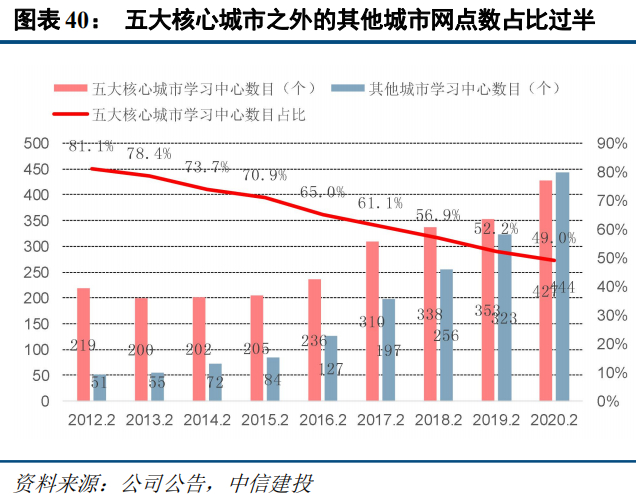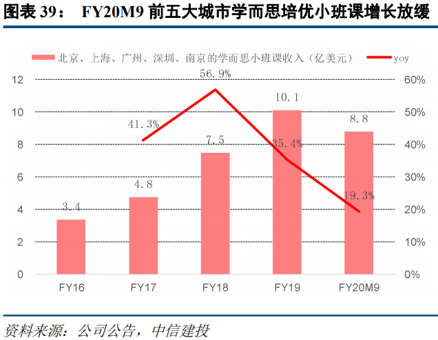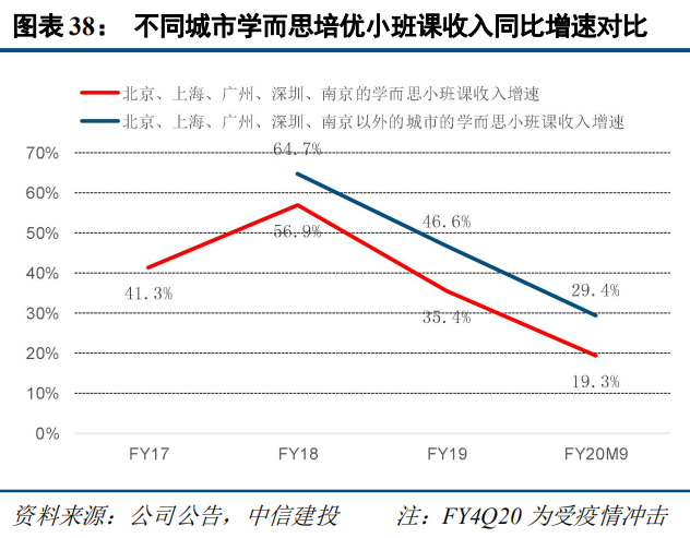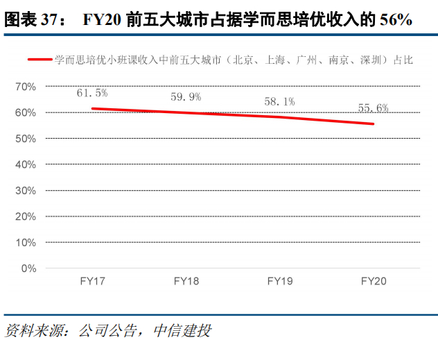 一线城市具备人口基数庞大和人均收入较高的双重因素,因此是K 12培训市场的最大蛋糕,亦是好未来的基本盘。FY20好未来的前五大收入贡献城市分别为北京、上海、广州、深圳、南京,以学而思培优小班课为例,前五大城市的收入贡献约为56%,学习中心数量占比为43%。但伴随学习中心网点密度的快速增加,前五大核心城市收入增速有放缓趋势,FY19学而思培优小班课在前五大城市的收入同比增速为35.4%,FY2020 M9同比增速为19.3%,亦低于其他城市合计收入29.4%的同比增速。(FY2020Q4受疫情影响,不在此比较)
