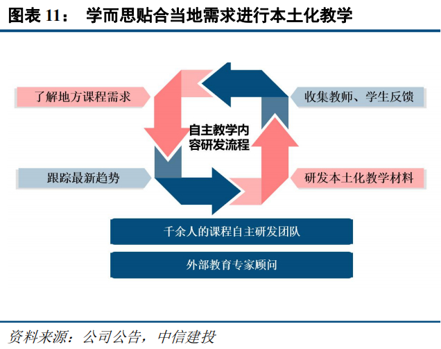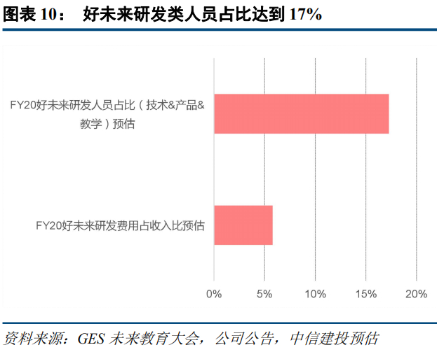 “大中台、小前台”助力专业化分工和教研本地化,强研发投入积聚公司赋能能力。公司由各个事业部总部的研发团队统一负责教学标准化设计,输出讲义、教辅、考卷等底层教研资源,开发和迭代智慧教育系统等,当地分校教研部门负责收集当地考卷、考情并在总部教学资源和系统平台的基础上再进行本土化改造。在中台模式下,授课教师可通过智慧教育系统等使用中台部门研发的试题课件、音视频素材等教学资源,只需熟悉教材例题和授课进度,即可保证课堂知识点的有效性,大幅提升了组织效率、标准化程度和公司赋能能力。公司目前有超过6000名教学、技术、产品研发人员,研发类人员预计占比达到17%,年研发经费超过10亿元,研发费用占收入比重约5%-6%,所研发的基于大数据的智能学习系统包括ITS智能教学系统和课件系统、IPS智能练习系统、IDO个性化学习系统。