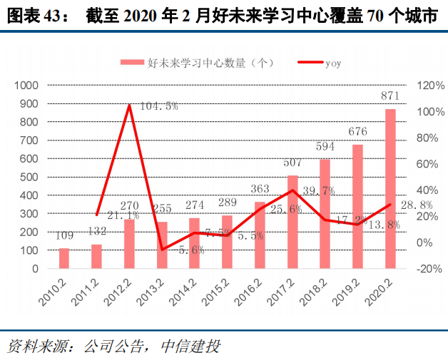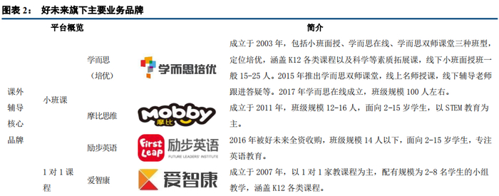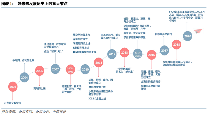 好未来前身成立于2003年,最初在北京海淀区提供小初数学培训,2007年将业务范围拓展至海淀区以外的北京其他区域,2008-2010年在天津、上海、武汉、广州、深圳等地设立分校,2010年在纽交所上市,成为国内首家在美上市的中小学教育机构。2011年公司将小班课程品牌正式命名为学而思,2012年起加速向二线城市渗透,2014年发布家长帮APP,2016年推出学而思网校直播课,2017年上线学而思在线,2018年起向三四线城市加速扩张。截至2020年2月底,好未来在国内外70个城市共拥有871个学习中心,是国内最大的K12培训机构,旗下培训品牌包括学而思培优、学而思网校、摩比思维、励步英语、爱智康等。