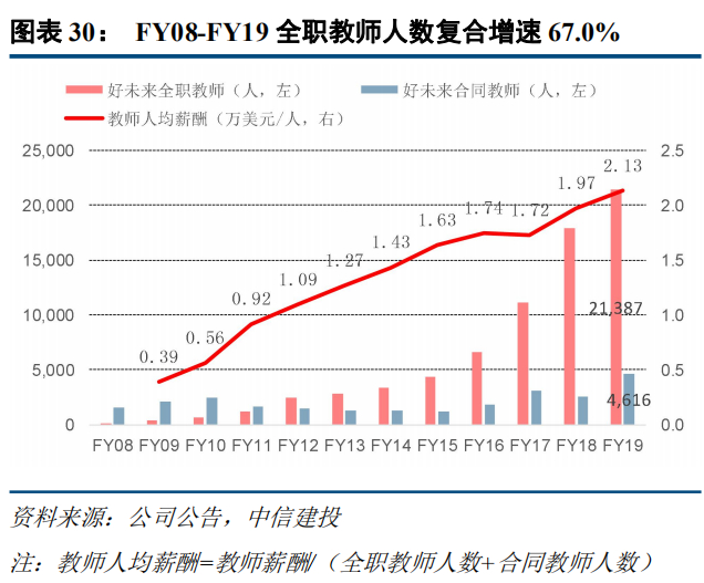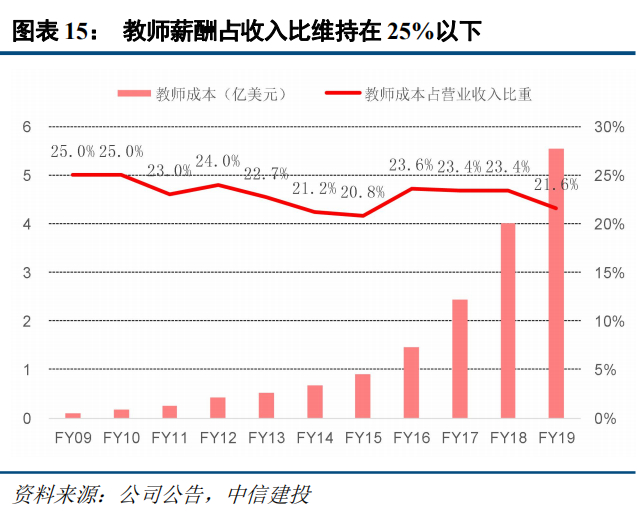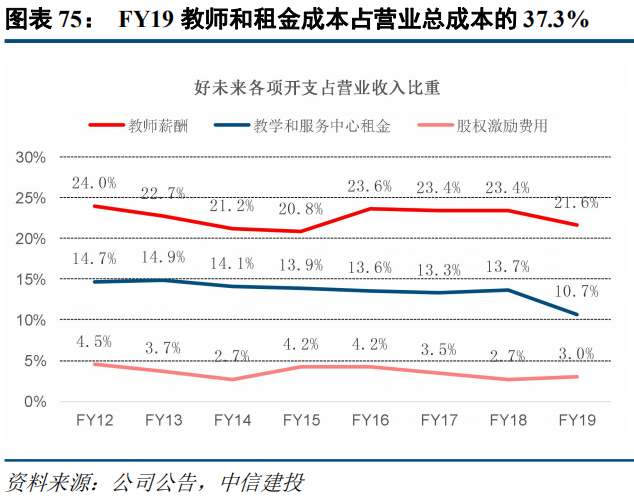 公司教师招聘以校招为主,老师多为985、211、师范院校毕业生,中台赋能下规模化输出优质师资。学而思新入职老师以校招为主,签约前有一个月以内的筛选式培训和考察;签约后,老师仍需接受3-6个月不等的文化课、技能课等日常培训,在考核通过后方可以正式授课。FY09好未来的合同教师占比高达85.0%,至FY13占比已快速降低至31.2%,对合同教师依赖度大幅下降。全职教师占比短时间的大幅提升依赖于公司的批量师资输出能力,而且教师薪资成本占收入比重控制在25%以内(FY17占比为23.4%)。