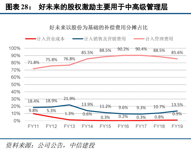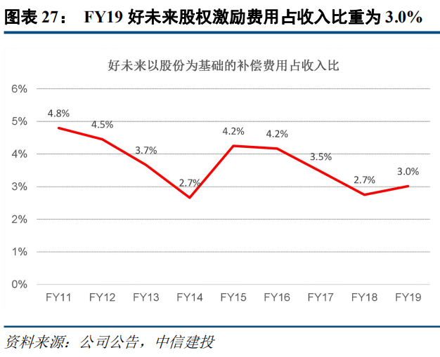 人才是培训公司最核心资产,公司股权激励主要用于绑定管理层。好未来常年会拿出股份激励公司员工,FY11-FY19间以股份为基础的补偿费用占收入比在2.7%-4.8%之间波动,FY19占比为3.0%,从股权激励的拆分来看,计入管理费用占比达到85.6%,计入销售及营销费用为13.5%,计入营业成本为0.9%。