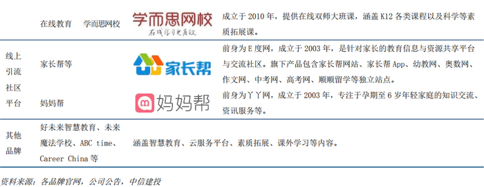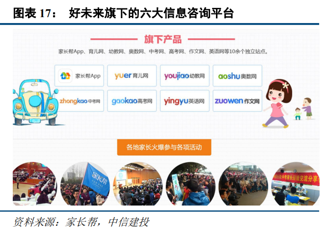 家长帮等社区资讯交流平台沉淀庞大家庭群体,为公司培训业务开拓种子用户和持续导流。公司旗下家长帮平台始于2003年,作为国内最大的K12学生家长社区,旗下产品包括育儿网、幼教网、奥数网、中考网、高考网、作文网、英语网等10余个产品矩阵,覆盖K12全年龄段。通过本地化运营26个地方分站,家长帮覆盖中国绝大部分省份,月度覆盖3000万家长,累计覆盖68%的中国家长,为异地扩张提供种子用户、持续导流及二次口碑转播。