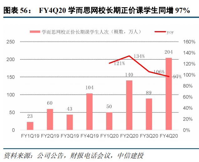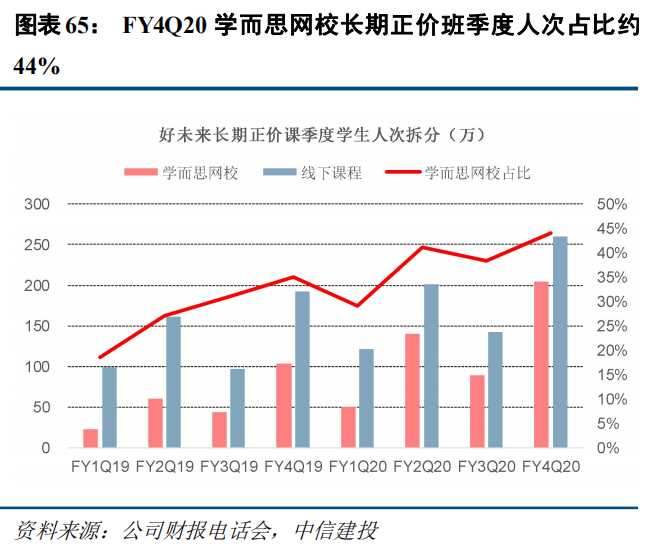 FY4Q20,正价长期课学生人次中学而思网校占比已达44%,收入占比达24%。FY20学而思网校长期正价课学生人次约483万人次,同比增长111%,占公司长期正价课人次比重的40.0%。其中,FY1Q20-FY4Q20长期正价课学生人数分别为50、140、89、204万人次,分别同比增长121%、134%、106%、97%,FY20四个季度学而思网校收入占比分别达到15%、16%、18%、24%。