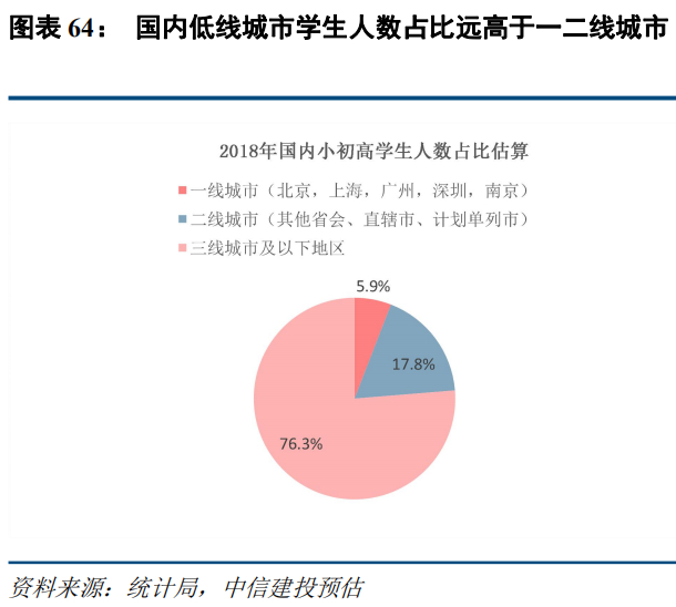 疫情下的变化,从一二线城市走向三四线城市,学而思网校迎来绝佳的下沉机遇。猿辅导、作业帮由于拍照搜题工具、题库APP的用户一半以上分布在三四五线城市和农村,因此其直播课的用户很大比例来自三四线城市,而学而思网校并无此类优势。从过往广告投放来看,学而思网校在此次新冠疫情前的主攻城市为一、二线城市,也是学而思在线下的核心城市。在疫情期间,免费直播课吸引了超过2000万人的观看,其中大部分为三四线学生用户,学而思网校用户中三四线城市占比迅速提升。根据测算,国内一线五大城市的中小学生人次占比为5.9%(预计1100万左右)、二线省会城市为17.8%(预计3400万左右)、三线城市及以下地区占比为76.3%(预计1.4亿左右),三线城市以下的学生量远多于一二线城市,且网校较为便宜的价格是其可以负担起的。FY4Q20学而思网校的正价长期课人次已达204万人次,虽然疫情期间免费课无需用户注册,短期转化率可能极低,但讲起到巨大的品牌宣传效果。基于学而思网校的课程价格和三四线线下培训班价格差不多,但师资显著好于当地水平,我们认为未来低线城市可开拓潜力巨大。