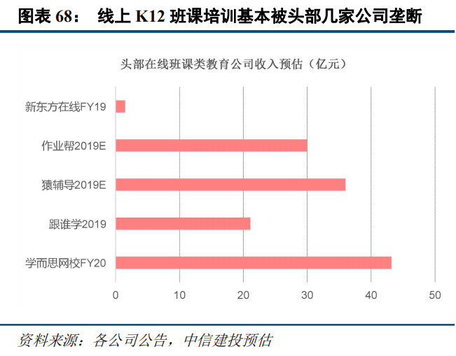 相比线下,在线教育行业集中度非常高,头部公司未来收入有望达到300亿元。作为国内线下K12培训龙头公司,FY20好未来的收入达到229.3亿元人民币,但是按照全国6000亿K12培训市场计算,其市场份额仅有3.8%。而在线双师大班课市场的头部玩家非常集中,前5名分别为学而思网校、猿辅导、作业帮、跟谁学、新东方在线,预估CR5的市场份额在60%以上,其中学而思网校FY20收入为6.16亿美元,位居行业首位。若未来在线教育的渗透率能达到20%以上,意味着全国1.8亿中小学生中将有3600万上网课,估算其中班课市场份额超过80%,客单价为4680元/年(900元/季度*4季度*生均1.3门课),则在线K12班课市场空间有望达到1348亿元,我们认为头部在线教育公司市场份额将达到25%以上,对应收入体量将达到337亿元以上。
