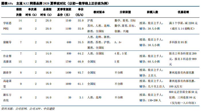 相比竞争对手,学而思网校拥有强大的品牌背书及更丰富的教材版本。作为国内最大也是美誉度最高的K12培训机构,学而思在品牌认可度上要远高于竞争对手,全国70个城市的线下学习中心布局也使家长和学生对学而思网校有更高信任度。从产品端来看,学而思网校对于不同教材版本的覆盖度和课程难度的分层相比竞争对手做的更为精细,以2020年初一的夏季班数学学科为例,学而思网校的教材版本达6个、难度分为5档,相比而言,部分友商仅为全国版教材。