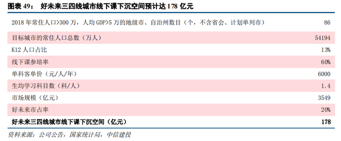 预计好未来现阶段三四线城市线下沉空间可接近200亿元。2018年全国常住人口300万人以上、人均GDP 5万元以上的地级市、自治州(不含省会、计划单列市)共计86个,其常住人口规模5.4亿人,假定K12人口占比13%、线下课参培率60%、单科客单价6000元/年、生均学习科目数1.4科,则线下培训市场空间预计3551亿元,若好未来市占率达到5%,则对应178亿元的潜在收入空间。