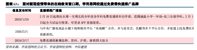 新冠疫情催生的行业机遇,在线教育行业及学而思网校将加速增长。2020年1月新冠疫情爆发以来,线下培训被全部暂停,在线教育迎来发展良机。学而思网校响应“停课不停学”,于疫情期间在“央视频”、“学习强国”、爱奇艺、优酷等平台合作推出免费公益直播课。截至2020年5月10日,学而思网校在央视频发布教学视频突破1万个,总播放量达到6.2亿次,预计多渠道观看免费直播课的学生人数超过2000万以上。公司预计2021财年一季度(2021年3月-5月),学而思网校的收入将增长100%以上。