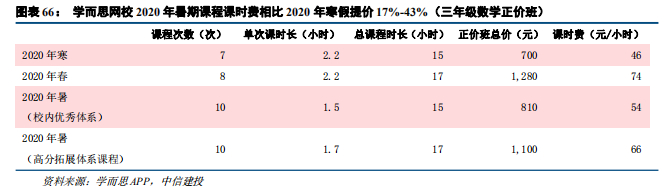 FY21学而思网校开启提价进程,努力做正价课转化减少亏损。受在线教育生源争夺影响,FY20学而思网校正价课ASP有所下降,以学而思网校收入/学而思网校长期正价班学生人次估算,FY1Q20-FY4Q20学而思网校正价课ASP分别为211、107、174、101美元/人次,同比分别下降5.9%、19.7%、14.1%、15.4%。进入FY21,受到疫情催化,各家在寒假期间均获得海量免费课程流量。学而思网校亦从参与行业价格战向做正价课转化和提价转变,以小学三年级数学正价课课时费为例,学而思网校2020年暑期课时费在54-66元/小时,相比2020年寒假提升17%-43%。