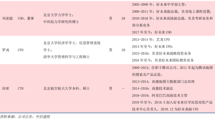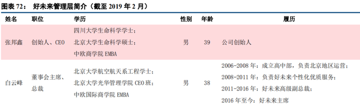 张邦鑫为公司创始人及首席执行官,现年39岁,毕业于四川大学生命科学学士、北京大学生命科学硕士、中欧商学院EMBA,截至2019年12月共持有公司27.45%股份,是公司第一大股东。公司实行AB股架构,截至2019年5月,张邦鑫持有71.8%的表决权。公司董事会主席白云峰持有公司2.5%的表决权,现年38岁,北京大学航空航天系工程学士、北京大学光华管理学院CEO班、中欧国际商学院EMBA,历任好未来高中部(北京地区)负责人、高级副总裁等职。公司COO刘亚超持有公司10.1%的表决权,现年38岁,为北京大学力学学士、中科院力学研究所博士,历任好未来中学部主管、副总裁、高级副总裁等职。