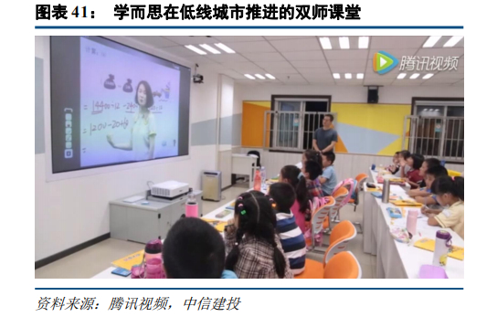 培训机构下沉三四线城市过程中的最大难点是师资难以下沉,学而思通过推出双师课堂解决此问题。2015年学而思开始推出全新教学模式——线上线下相结合的双师课堂,即学生在线下的学习中心上课,主讲老师通过线上授课、与学生实时互动,辅导/学管老师同时在线下课堂中进行课堂指导、跟进学生听课和学习情况。虽然低线城市学生所付的课时费低于高线城市,但是在双师课堂模式下,主讲老师可以同时和多个班级上课从而放大师资杠杆,使得低线城市学生享受高线城市优质师资在商业上成为可能。