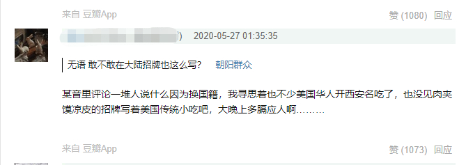 正是基于这一疑问,相关视频和图片在抖音、豆瓣等社交平台上迅速引起热议,大量网友参与讨论并提出质疑。例如,有网友表示,“不少美国华人开西安名吃,也没见肉夹馍凉皮的招牌写着美国传统小吃”。