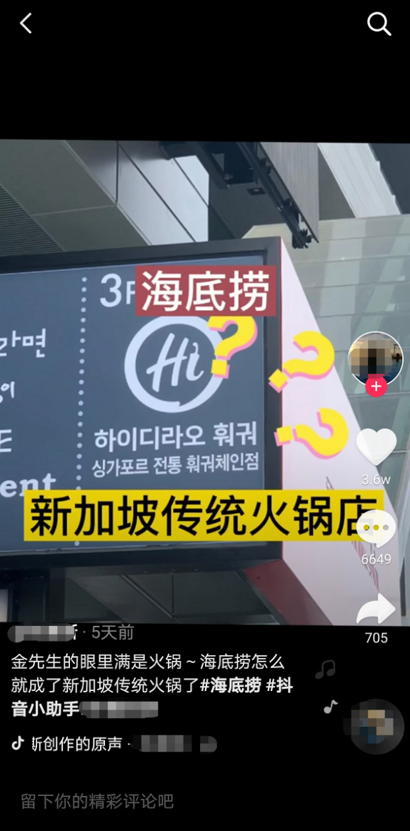 日前,有抖音用户晒出小视频,在韩国某地的“海底捞”门店上,公然挂出“新加坡传统火锅店”的宣传标语。“还是新加坡传统火锅,传统二字有点过分啊”,该用户在视频中表示。