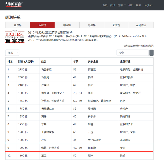 而在海底捞的生意蒸蒸日上之时,张勇夫妇的财富也在不断累积。2019年8月,福布斯发布新加坡富豪50强排行榜,张勇以约合989亿元身家,击败位居榜首10年的远东机构黄志祥和黄志达兄弟,成为新加坡新首富。在胡润发布的2019年胡润百富榜中,张勇、舒萍夫妇更是以1200亿元的财富杀入前十榜单,与王健林家族比肩。