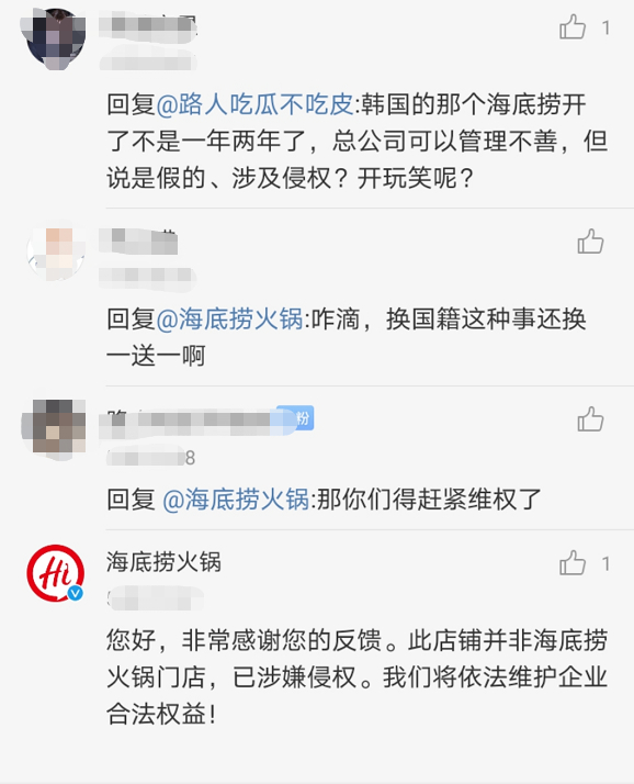 显然,海底捞变身“新加坡传统”的说法伤害了大量吃货的感情。在大量争议之下,海底捞官微终于现身辟谣,称“此店铺并非海底捞火锅门店,已涉嫌侵权”,并称将依法维护企业合法权益。然而,同样有网友认为,该店开设“已经不是一年两年”,对海底捞官微的说法提出质疑。