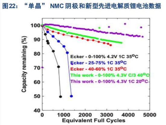 在传统三元电池中钴主要起到稳定结构的作用,然而由于钴价昂贵,高镍去钴成为降本的重要途径之一。下图显示了如何在使用 NMC 622 和 NMC 811 电池的同时使用比 NMC 532 更少的钴并获得更高的能量密度的情况下获得高循环数据。据 electrek 报道显示,特斯拉电池研究合作伙伴 Jeff Dahn 及其团队研制出的“单晶” NMC 532 阴极和新型先进电解液的锂离子电池可以在在电动汽车中行驶超过 100 万英里,进行超过4,000 次循环。