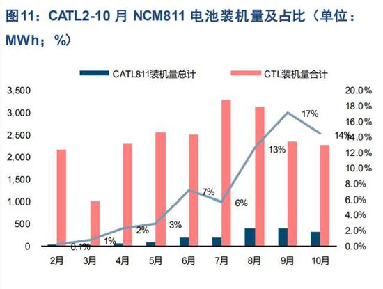 CTP 和 NCM811 技术满足电池包需求,率先量产高镍 NCM811 电池,能量密度持续突破。据 2019 年 10 月 19日高工锂电网文章报道称,宁德时代第一代高镍+石墨体系的 NCM811 电池(镍、钴、锰比例为 8:1:1)单体比能量已超 240wh/kg,系统能量密度可达 180wh/kg,实现续航超 500km,相比 NCM523 大幅提升。第二代高镍+硅碳体系的 NCM811 电池正在开发过程中,单体比能量突破 300wh/kg,系统比能量密度或超 200wh/kg,待技术成熟后将推向市场。据 2019 年 11 月 20 日第一电动报道称公司 NCM811 电池占总装机量占比不断提升,目前主要为宝马 X1、几何 A、帝豪 GSe、威马 EX5、启辰 D60EV、蔚来 ES6、小鹏 G3、合众 U、广汽 AionS/AionLX等车型配套装机。