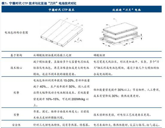 CTP 技术大幅度提高成组效率和能量密度。2019 年法兰克福展宁德时代推出了全新的 CTP 高集成动力电池开发平台(Cell to Pack),简称无模组技术,是一种由电芯到电池包的新型电池结构。CTP 技术具有以下显著优势:1)轻量化:最大程度减少各个模组之间侧板、底板、连接线束、固定件、非必要的横纵梁等零部件 2)提效降本:因省去模组环节、零部件数量减少,生产效率提升,可显著降低动力电池制造成本。据宁德时代发布的数据显示,CTP电池包体积利用率提高15%-20%,零部件数量减少40%,生产效率提升50%,成组效率的大幅提升,降低了电池成本,预计降幅在 10-15%。3)提升电池能量密度:电池包能量密度提升10%-15%,重量比能量密度可以达到 200Wh/kg,体积比能量密度可提升 50%。4)电池适配性不断增强:CTP 技术将使得电池包的集成服务于整车,回归于自上而下的整体设计逻辑,服务新能源汽车更多的可能性。宁德时代该技术目前已经获得车厂的生产订单,已确定的包括给大众(拉美)卡客车公司(VWCO)供应全新磷酸铁锂 CTP 电池,以及北汽新能源 EU5 乘用车。