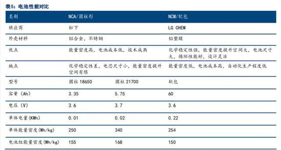 从 LCO 18650 到 NCA21700,电芯材料实现持续性突破。Model S 和 Model X 使用松下 18650 圆柱形电池,最新一代 18650 电池正极使用 NCA 材料,负极使用硅碳复合材料,硅碳材料再次提升了石墨负极材料比容量上限,单体能量密度可以达到 250Wh/kg。2016 年,特斯拉和松下共同成立了太阳能合资企业,在纽约州建立Gigafactory2,主要生产太阳能电池。2017 年 Gigafactory 为 Model 3 和 Model Y 生产规格更大的 21700 电池,正极材料由富钴的钴酸锂换成了低钴的 NCA 正极,材料成本和度电成本大幅降低,同时单体能量密度达到 340Wh/kg, 装配成组效率不高,为 186Wh/kg。据特斯拉公告,Model 3 的电芯能量密度在同款竞品中居最。电池更新换代的整个过程中,镍含量更高,钴含量更少,电池体积增大,单体能量密度显著提升,电池总数更少,电池组具有更高的充电速率,更易实现一致性管理。