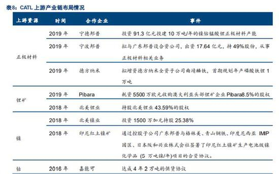 布局上游产业链,自身降本,成本优势彰显:宁德时代绑定深度绑定上游稀缺资源,积极开展纵向一体化布局。根据智研咨询报告显示,正极材料成本在目前动力锂电池成本中占去 25%至 30%。正极材料主要由碳酸锂及镍钴锰前驱体材料构成。宁德时代采用入股和合资的模式,布局三元正极、磷酸铁锂、锂、镍、钴等稀缺资源,以应对降成本压力。