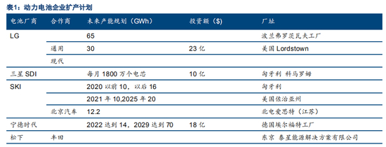 新能源汽车主要由“电池+电机+电控”构成动力总成,其中动力电池占成本最高,同时性能最为关键。动力电池行业具有“三高”属性,高资本投入、高技术壁垒和高不确定性,因此我们看到动力电池行业呈寡头垄断趋势(2019 年 CR5 约 75%,2020 年 Q1CR5 约 815),宁德时代、LG 化学、松下、BYD、三星 SDI 等巨头依然在大幅扩产中(见表 1),同时整车企业中特斯拉,大众、沃尔沃、上汽等传统车企也在布局动力电池产能(见表 2)。